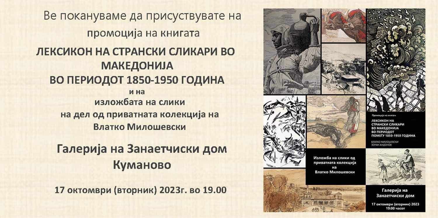 Во галеријата на Занаетчиски дом утревечер ќе биде промовирана книгата насловена „ Лексикон на странски сликари во Македонија во периодот помеѓу 1850 – 1950 година“ од авторите Влатко Милошевски и Зоран Андонов.