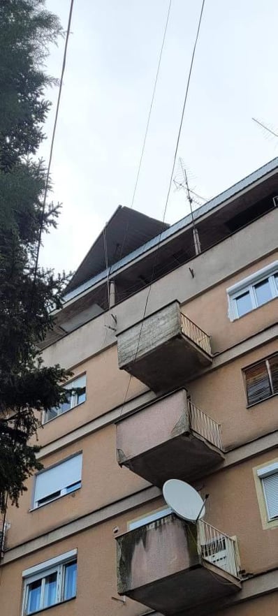Оштетен покрив на зграда во централното подрачје, по синоќешниот ветер. Просторот околу зградата е ограден со полициска лента која укажува на опасност, поради надвиснатиот покрив. На терен интервенираше екипа на противпожарната единица Куманово.