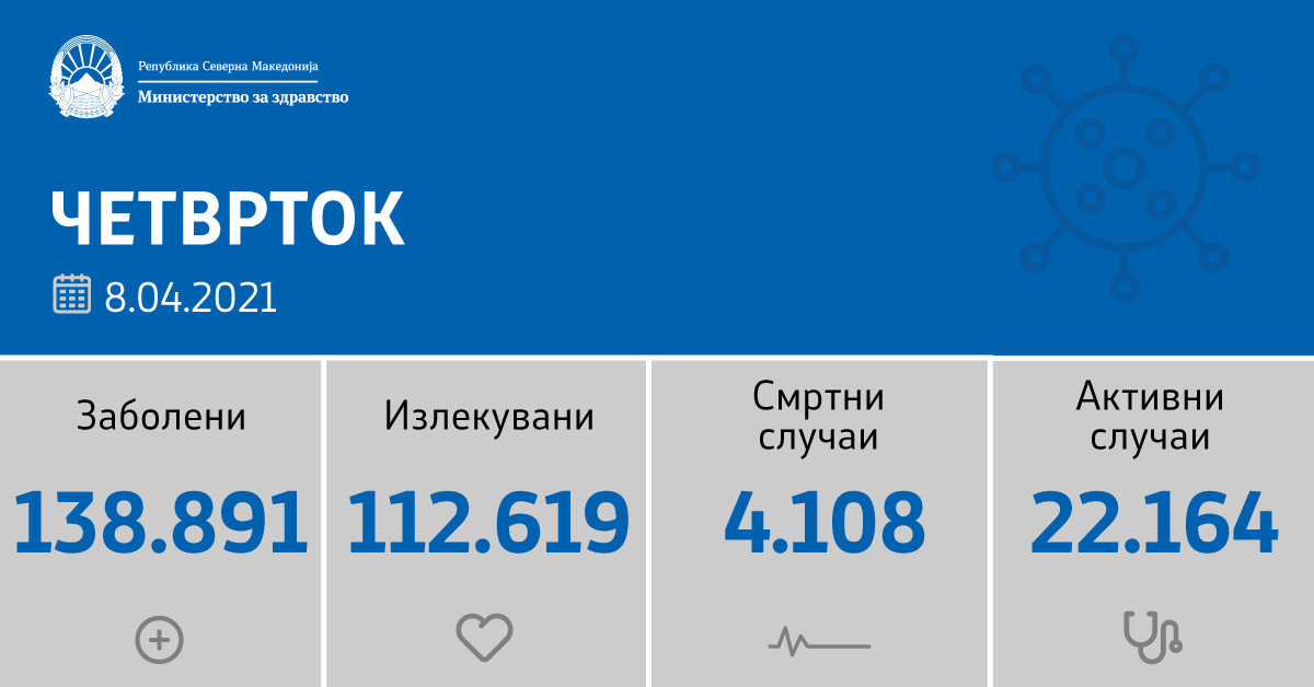 Досега во земјата се направени вкупно 655.924 тестирања на Ковид-19. Вкупната бројка на КОВИД-дијагностицирани лица во нашата земја од почетокот на епидемијата изнесува 138.891, бројката на оздравени пациенти е 112.619, на починати е 4.108, а бројот на активни случаи изнесува 22.164.