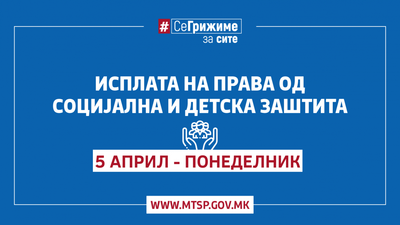 Министерството за труд и социјална политика информира дека денеска започна исплатата на правата од социјална, детска и цивилна заштита (сите парични прaва) за месец март 2021 година.