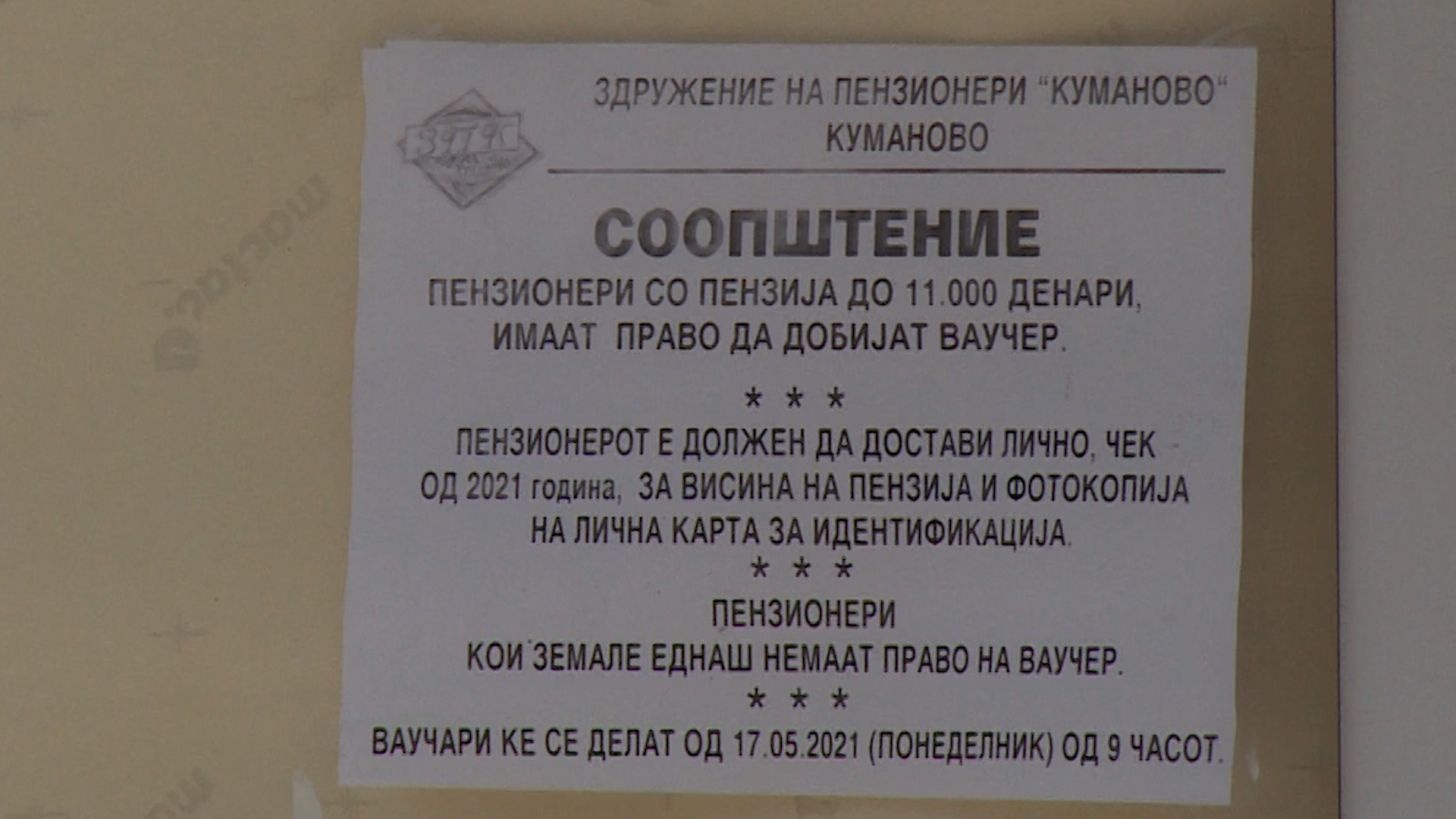 Здружението на пензионери Куманово утре ќе ги подели последните 100 ваучери на своите членови кои што имаат пензија до 11.000 денари. Изминативе два дена беа доделени вкупно 650 ваучери во износ од 1.000 денари на пензионерите со ниски пензии. За ваучер годинава немаа право да се пријавуваат пензионерите кои што веќе користеле ваучер претходните две години. Оваа активност влегува во годишната програма на здружението врз основа на планираниот финансиски план.