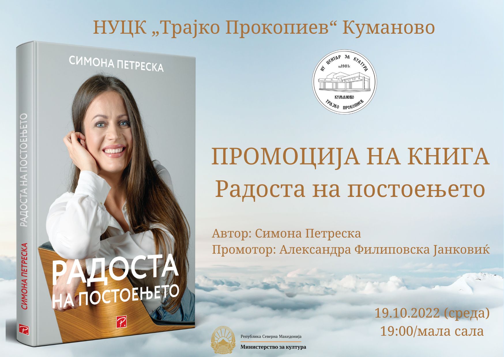 Вечерва со почеток во 19 часот, во малата сала на Центарот за култура, ќе се одржи промоција на книгата „Радоста на постоењето“ од Симона Петреска. Промотор на книгата е Александра Филиповска Јанковиќ. Настанот е дел од годишната програма за литература за 2022 година поддржана од Министерство за култура.