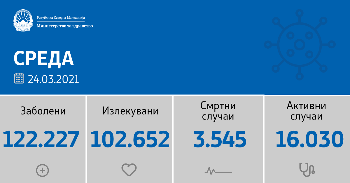 Read moreМинистерството за здравство информира, согласно податоците од Институтот за јавно здравје: Во последните 24 часа се направени 4.096 тестирања, а
